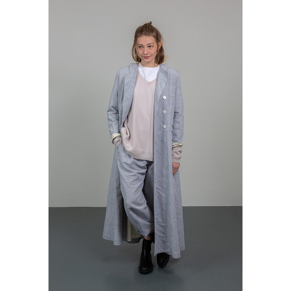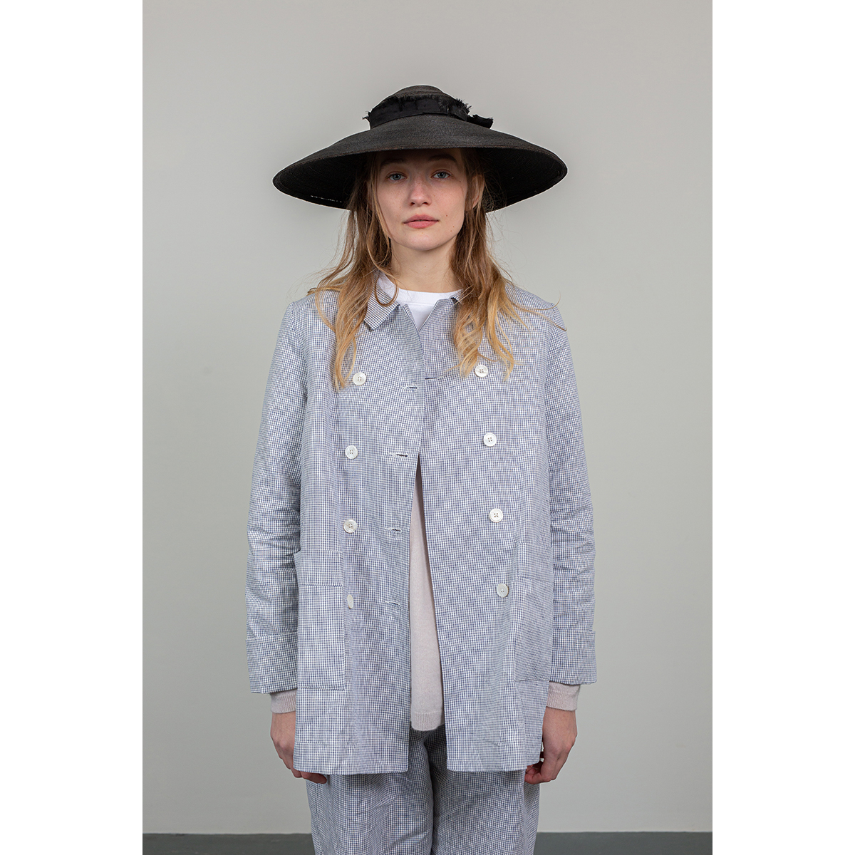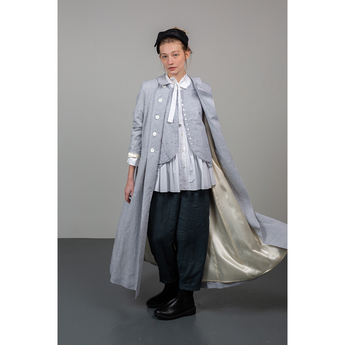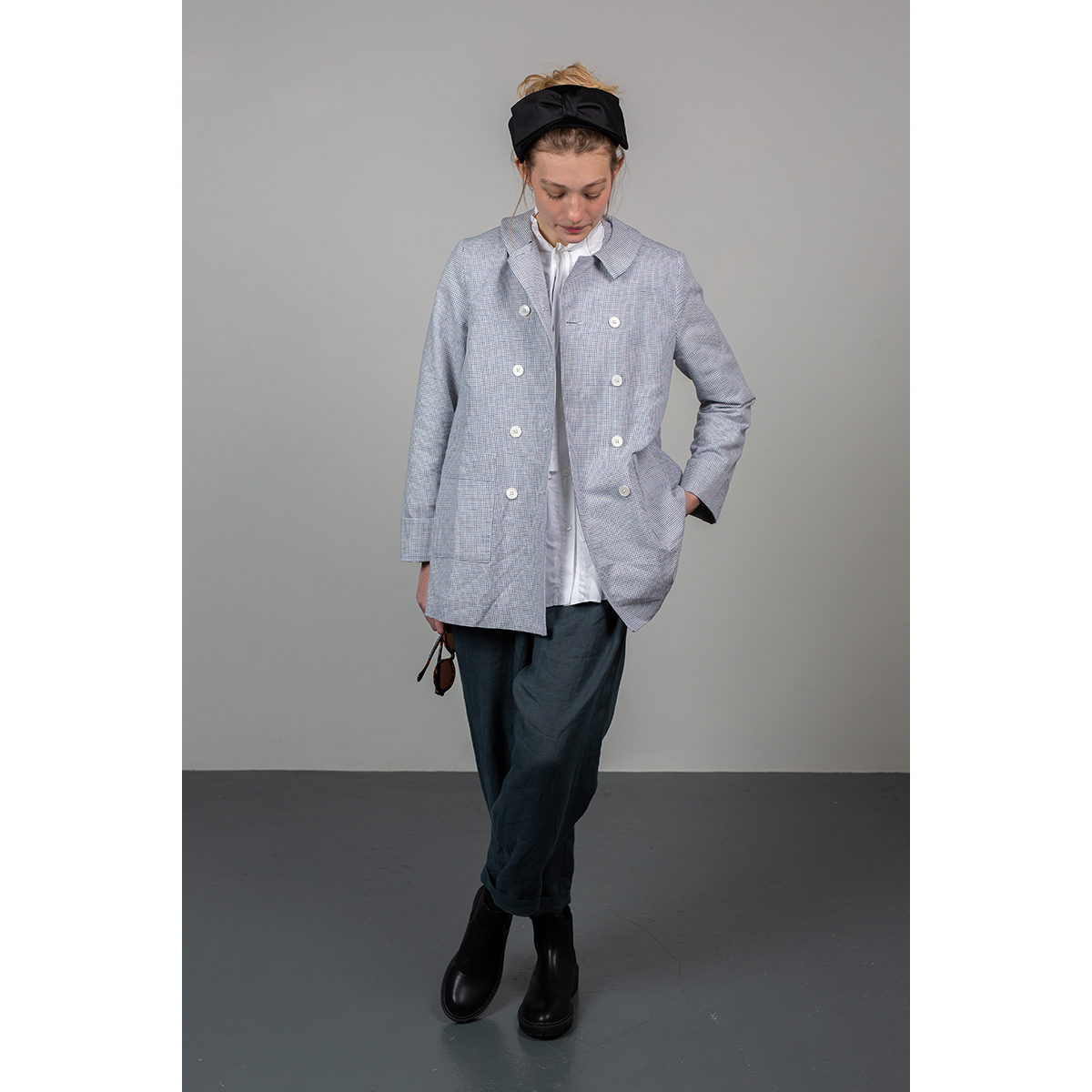 Cassandra Coat & Waist Coat in Organic Cotton Linen Mix in Blue & White Check. Jack Shirt in Organic Cotton & Camilla Trousers in Organic Navy Linen |