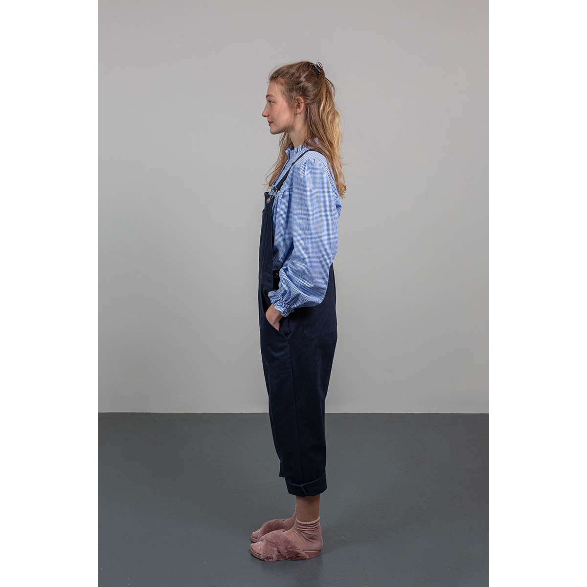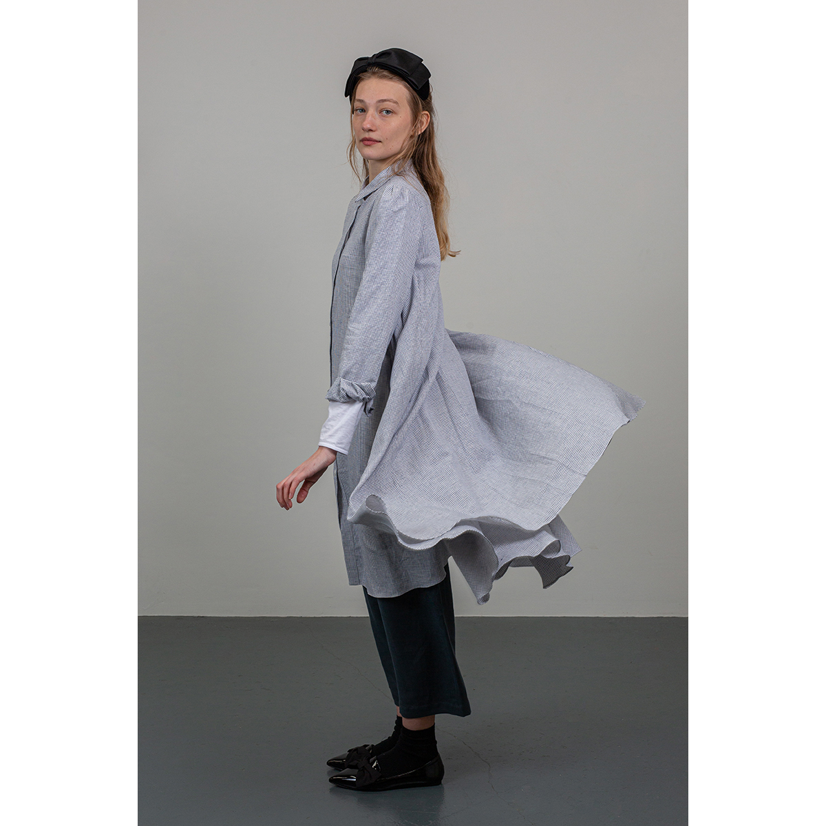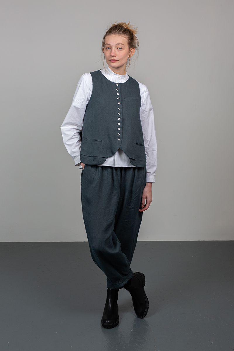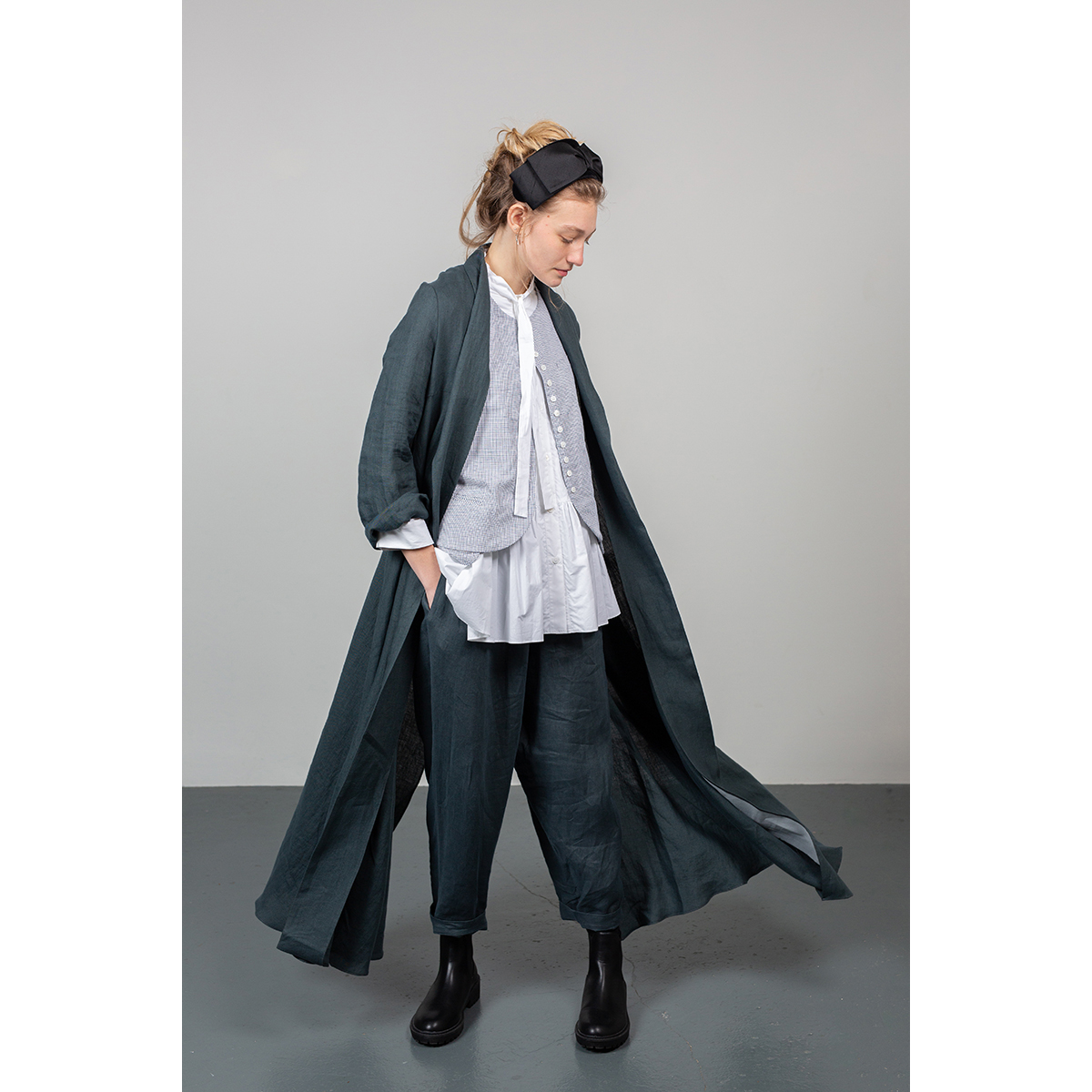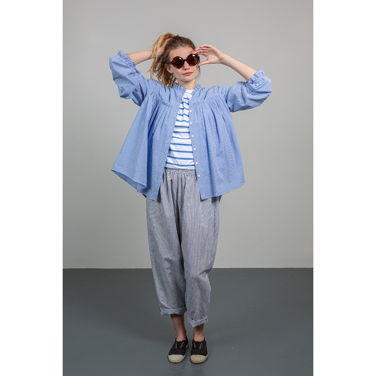 Cassandra Coat & Waist Coat in Organic Cotton Linen Mix in Blue & White Check. Jack Shirt in Organic Cotton & Camilla Trousers in Organic Navy Linen |