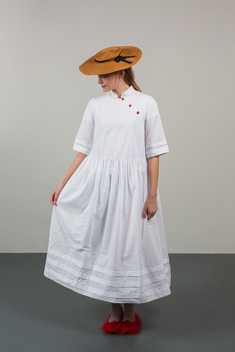 Augie Dress in White Seersucker with Organic Red Buttons with Prudence Millinery Hat |