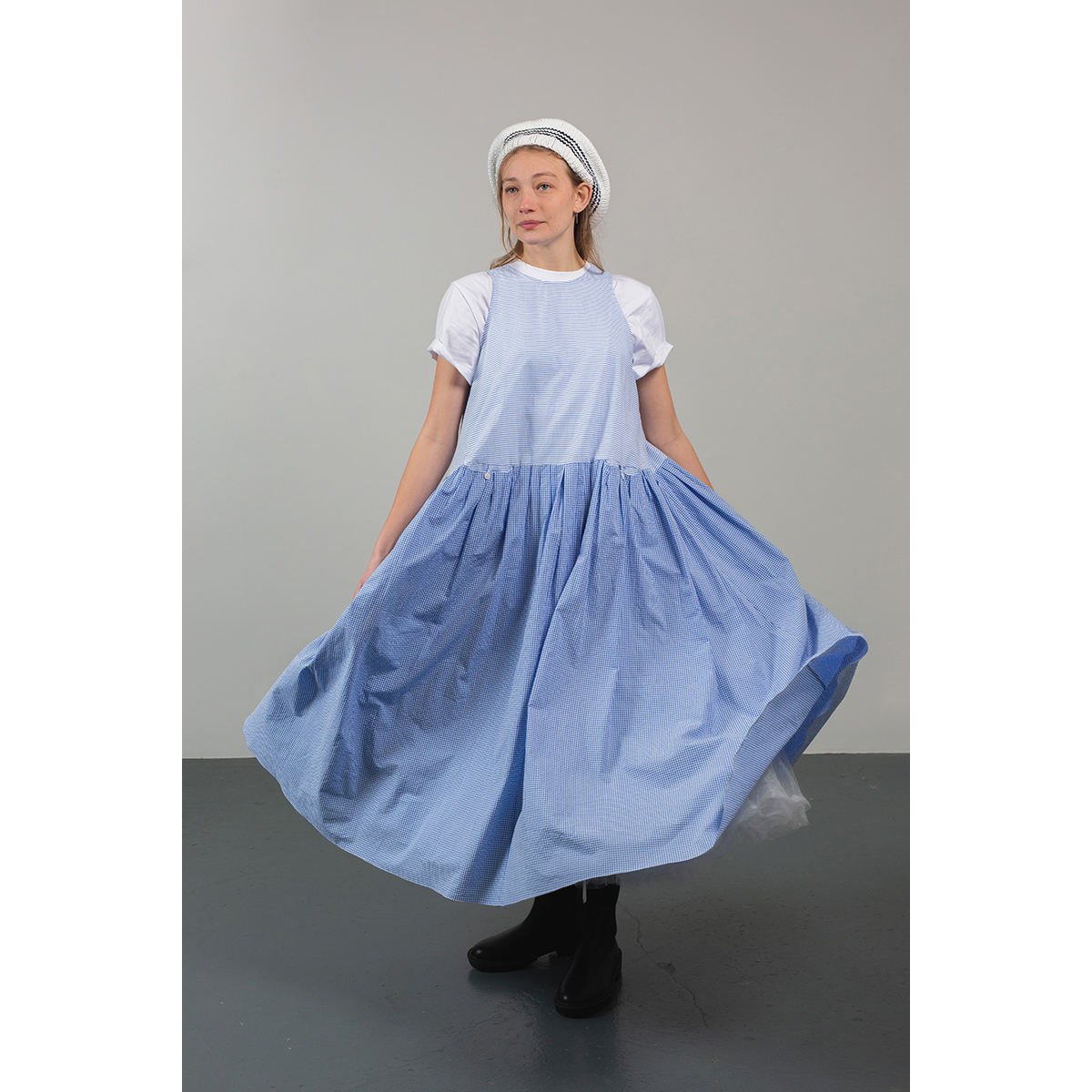 Bertie Dress in Organic Cotton Linen Mix in Blue & White Check with Prudence Millinery Hat |