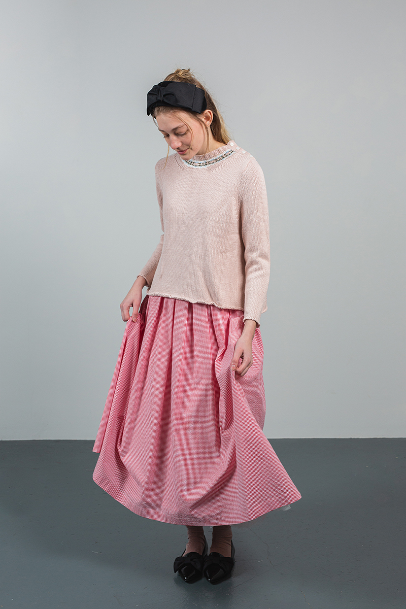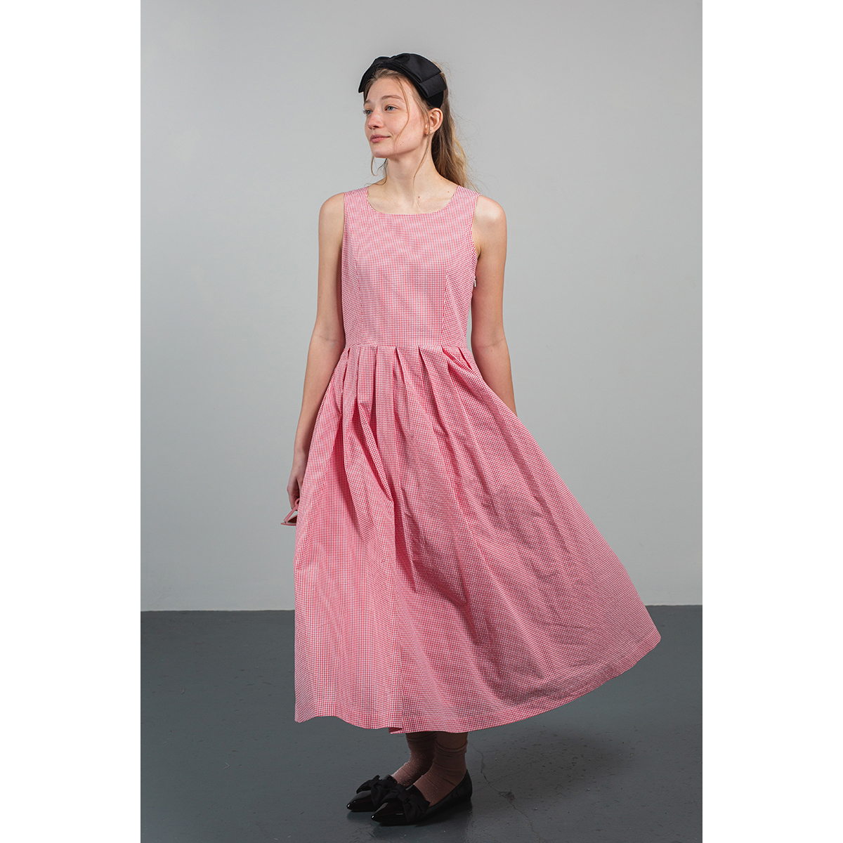 Blanche Dress in Red Seersucker Gingham & Angeline Sweater in Pink with Prudence Millinery Hat |