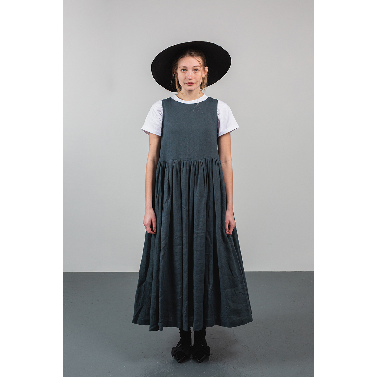 Bertha Dress in Organic Navy Linen with Prudence Millinery Hat |