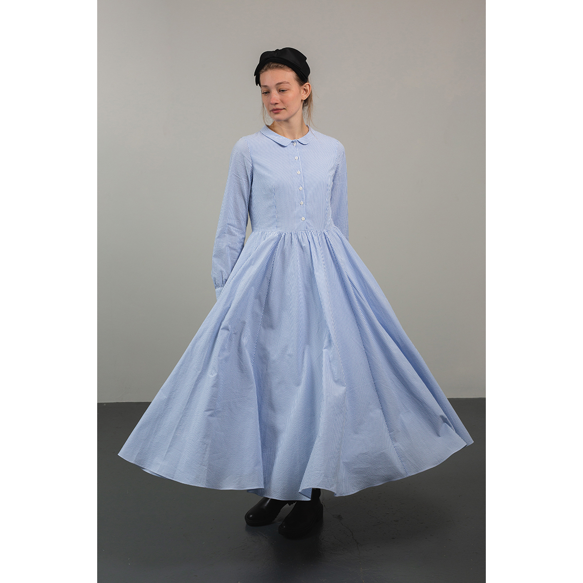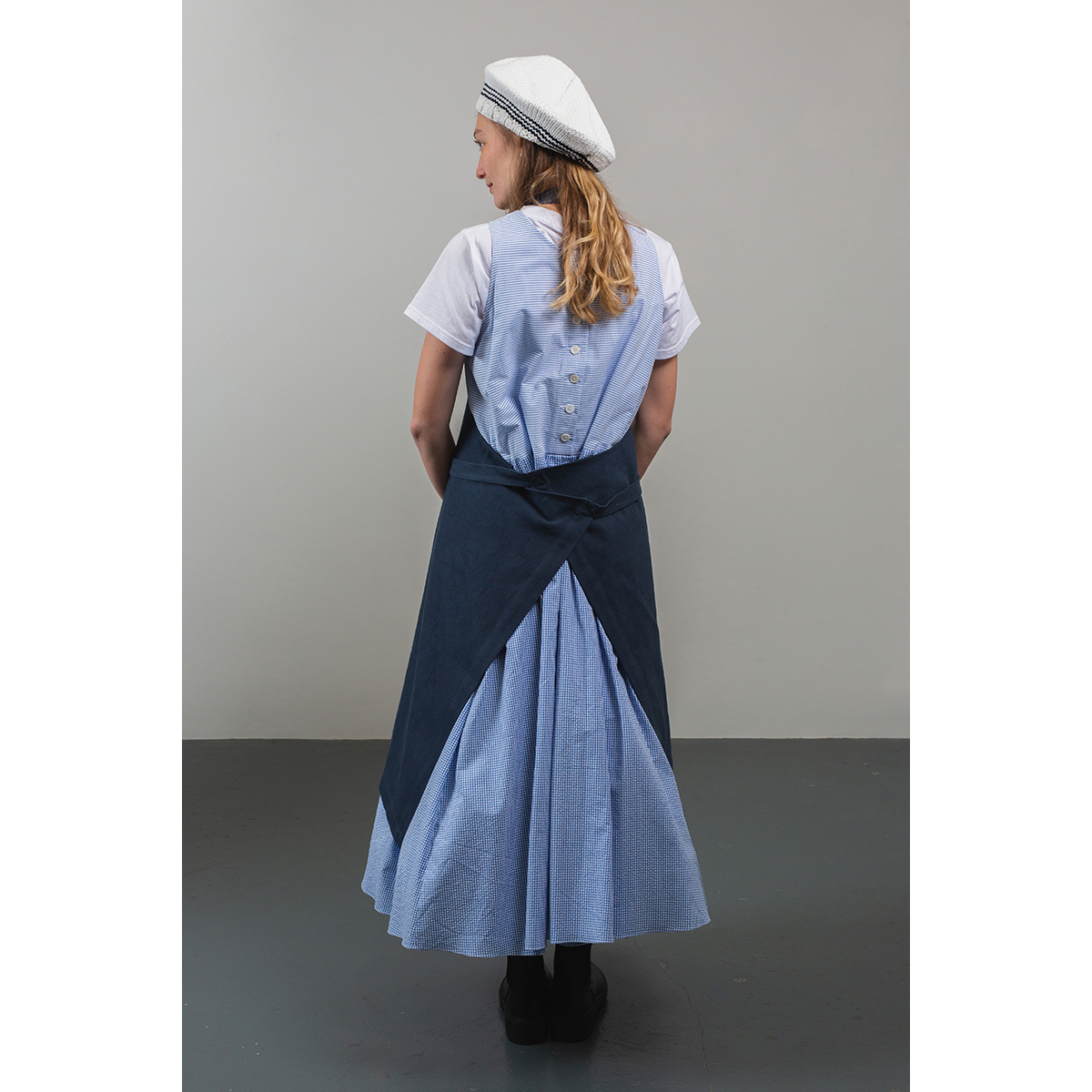 Cathy Dress in Blue Seersucker Gingham & Blue Striped Cotton with Organic Cotton Beret |