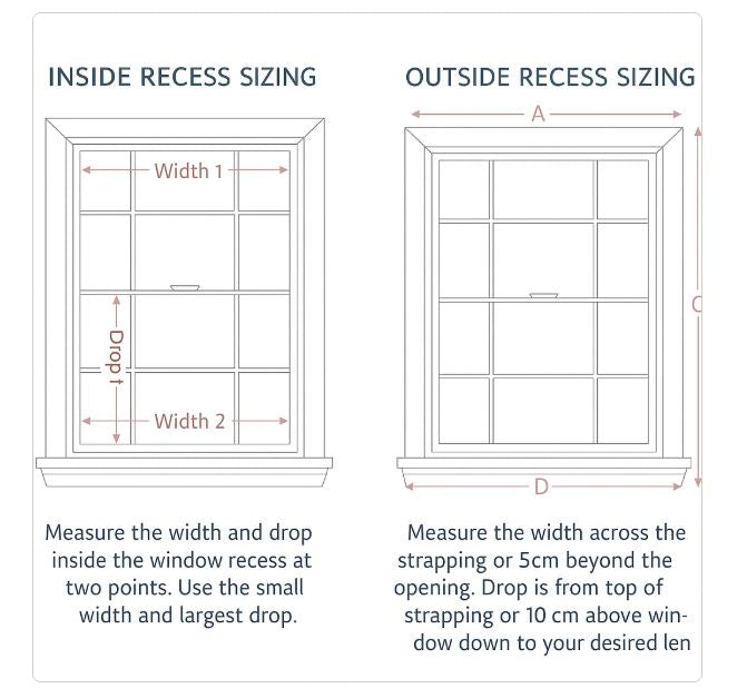 Outside Recess Sizing: Measure the width of the blind across the wooden strapping above the window (A–B). If no strapping or facing is present, measure 5cm beyond each side of the window space. If there are window facings, measure the full width of the facing. Measure the drop (height) from the top of the strapping or facing (C–D). If there’s no strapping or facing, measure from 10cm above the window down to the desired blind length.